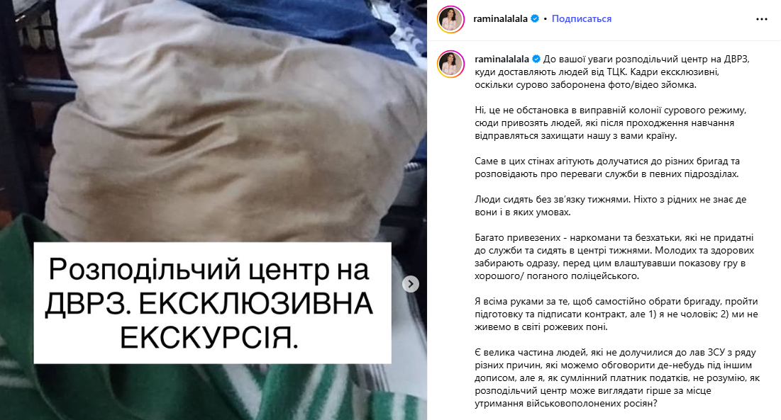 "Именно в этих стенах агитируют приобщаться к разным бригадам и рассказывают о преимуществах службы в определенных подразделениях. Люди сидят без связи неделями. Никто из родных не знает, где они и в каких условиях", – пишет Рамина.
