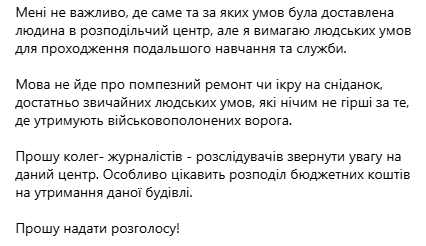 "Я всеми руками за то, чтобы самостоятельно выбрать бригаду, пройти подготовку и подписать контракт, но 1) я не мужчина; 2) мы не живем в мире розовых пони. Есть большая часть людей, которые не присоединились к рядам ВСУ по ряду различных причин, которые можем обсудить где-нибудь под другим сообщением, но я как добросовестный налогоплательщик не понимаю, как распределительный центр может выглядеть хуже места содержания военнопленных россиян?" – недоумевает автор.
