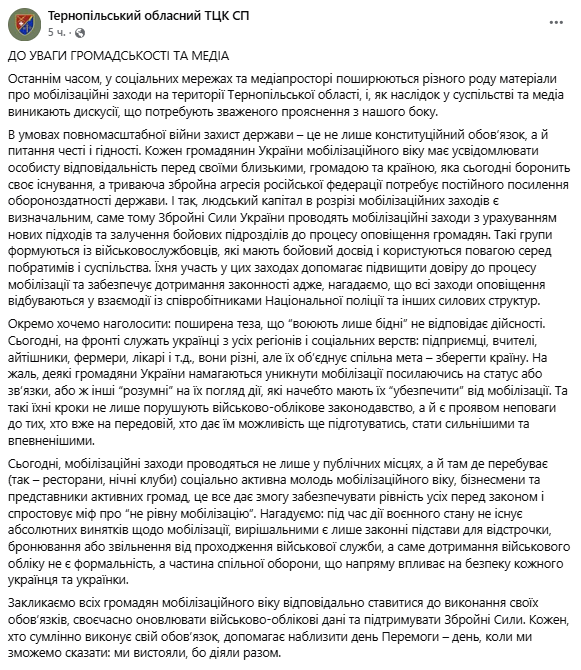 Представители террцентра заявляют, что во время действия военного положения не существует абсолютных исключений по мобилизации, решающими являются только законные основания для отсрочки, бронирования или освобождения от прохождения военной службы.