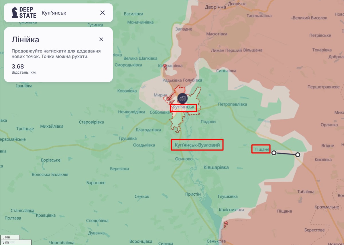 Военный эксперт Владислав Селезнев обратил внимание на попытки ВС РФ подойти к Купянску с юга, со стороны населенного пункта Купянск-Узловой. По его мнению, если россияне захватят новый плацдарм, то смогут развить наступление на Славянск и Краматорск.