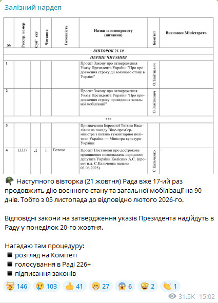- после голосования президент подпишет законы и Рада снова продолжит военное положение и мобилизацию.