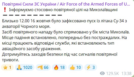 В 13 ч в канале Воздушных сил ВСУ появился комментарий по атаке ВС РФ на Николаев. Командование подтвердило, что в 12 ч с российского самолета Су-34 запустили средство воздушного нападения. Тип средства воздушного нападения устанавливается: произошел взрыв, от которого никто не пострадал.