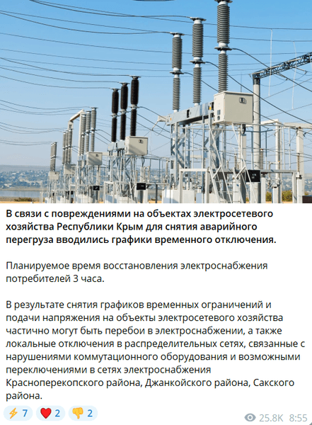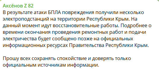 "В результате атаки БПЛА повреждения получили несколько электроподстанций на территории Республики Крым. На данный момент идут восстановительные работы", — аписал он, добавив, что жителей полуострова оповестят об окончании ремонтных работ, и попросив сохранять спокойствие.
