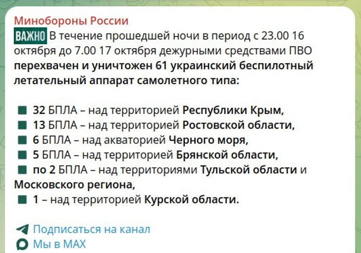 В Минобороны РФ отчитались об уничтожении 61 украинского беспилотника, из которых 32 – над Крымом.