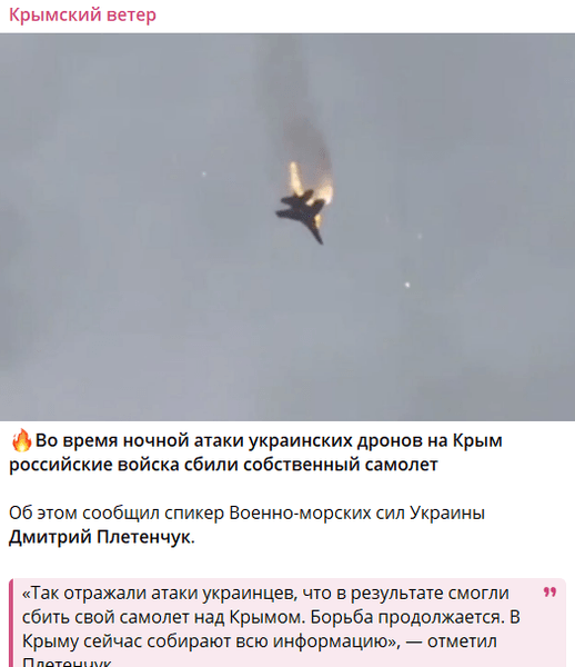 По информации этого же ресурса со ссылкой на спикера Военно-морских сил Украины Дмитрия Плетенчука, во время отражения атак украинских дронов в Крыму случайно сбили российский истребитель. Речь идет о Су-30СМ.