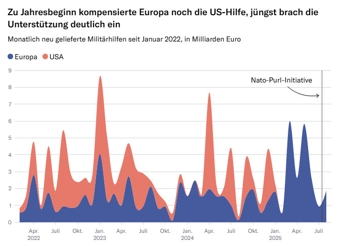 По данным NZZ, летом европейские обязательства по военной помощи сократились на 57% — с 3,8 млрд евро до 1,9 млрд евро в месяц. В целом поддержка всех стран-доноров уменьшилась примерно на 40% по сравнению с первой половиной года.