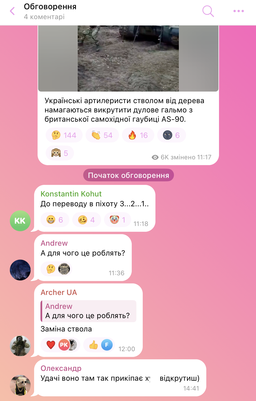 В комментариях под публикацией "In Factum" один из пользователей объяснил, что артиллеристы могут выкручивать дульный тормоз для замены ствола САУ. Другой комментатор также пожаловался на то, что он "прикипает" и поэтому открутить становится невозможно.