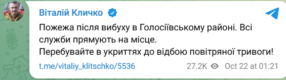 "Взрывы в Киеве. Работают силы ПВО. Находитесь в укрытиях!", — написал Кличко.