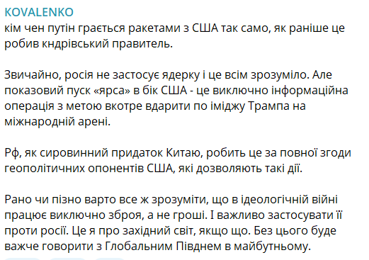 "Россия, как сырьевой придаток Китая, делает это при полном согласии геополитических оппонентов США, разрешающих такие действия. Рано или поздно следует все же понять, что в идеологической войне работает исключительно оружие, а не деньги. И важно применить ее против России. Это я о западном мире, если что. Без этого будет труднее говорить с Глобальным Югом в будущем", – написал он.