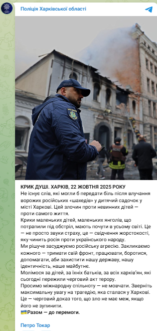"Не существует слов, которые могли бы передать боль после попадания вражеских российских "шахедов" в детский сад в Харькове. Это преступление против невинных детей против самой жизни. Крики маленьких детей, маленьких ангелов, попавших под обстрел, должны быть услышаны во всем мире. Это – не просто звуки страха, это – свидетельство жестокости, которую делает россия против украинского народа", – говорится в его сообщении.