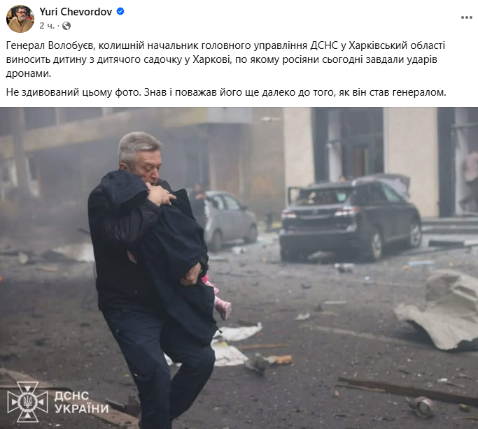 Тем временем СМИ облетел кадр, где мужчина выносит ребенка из разрушенного детсада. На фото ГСЧС – генерал-майор Александр Волобуев, который возглавлял Главное управление ГСЧС Харьковской области с 2015 года по май 2023-го и получил за службу около 20 наград.