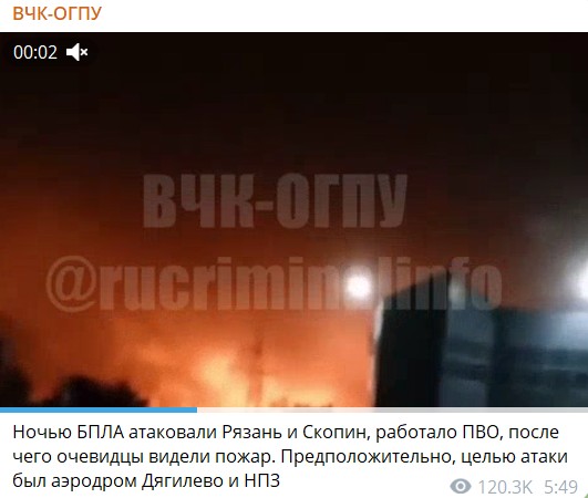 В Российской Федерации загорелся Рязанский нефтеперерабатывающий завод, рядом с которым расположен военный аэродром "Дягилево" и 360-й авиаремонтный завод. Удар могли нанести ракетами-дронами "Пекло", которые достали на 500 км.