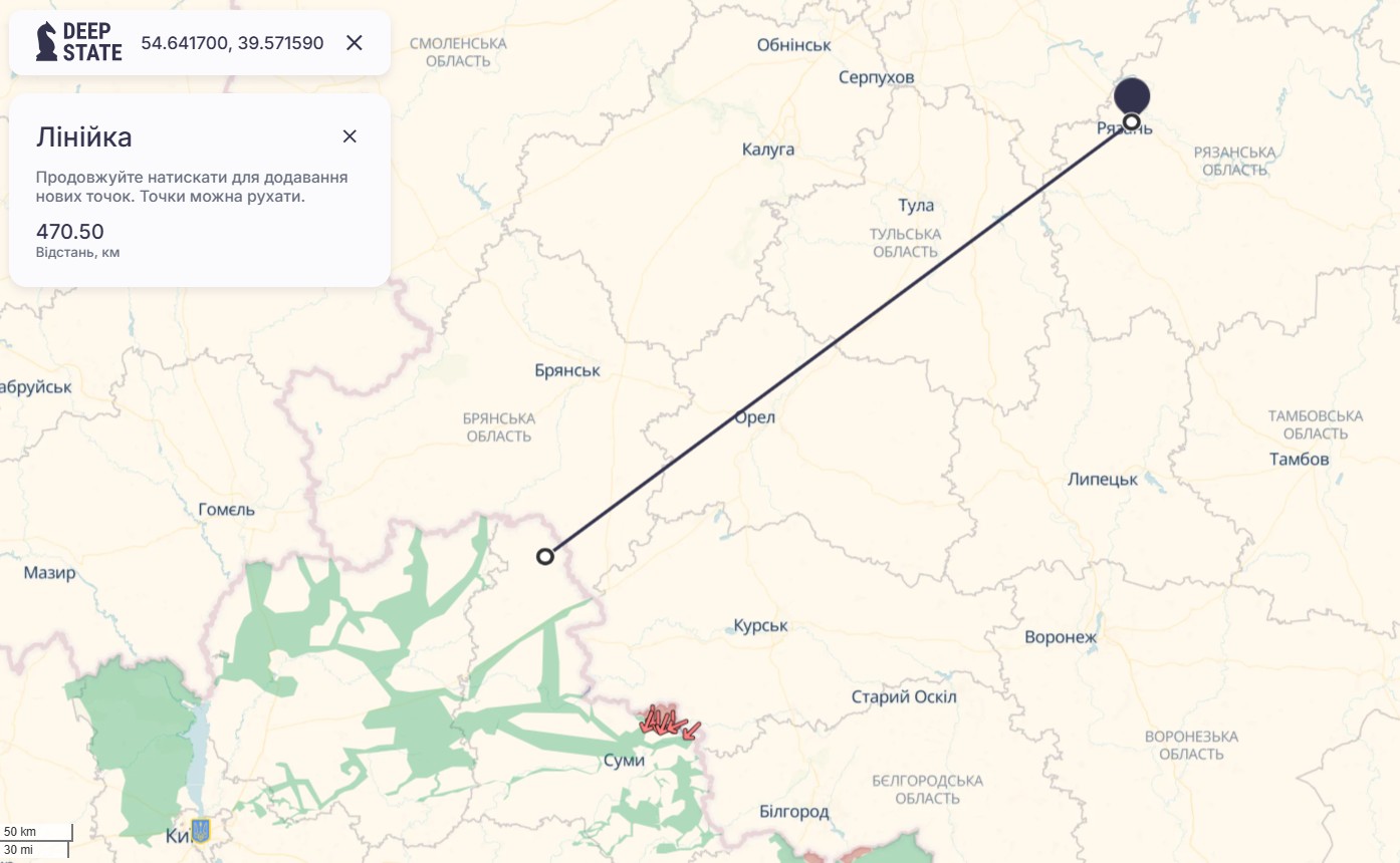 Командование Сил беспилотных систем ВСУ и Генштаб пока не информировали об атаке на стратегический объект РФ — Рязанский НПЗ и на возможные сопутствующие цели. На карте боевых действий проекта DeepState видим, что средства поражения должны были преодолеть почти 500 км и четыре области, чтобы добраться до целей.
