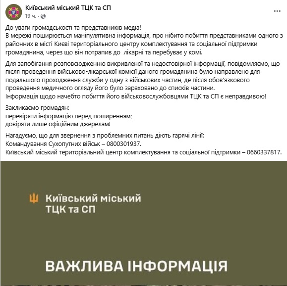 "Для предотвращения распространения искаженной и недостоверной информации сообщаем, что после проведения военно-врачебной комиссии этот гражданин был направлен для дальнейшего прохождения службы в одну из воинских частей, где после обязательного проведения медицинского осмотра он был зачислен в списки части. Информация о якобы избиении его военнослужащими ТЦК и СП является ложной!"