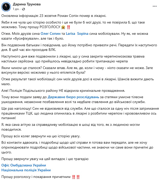 "Итак, результат такой мобилизации: сын моих друзей до сих пор в коме в больнице. Шансов выжить дают мало. Но! Полиция Подольского района не открыла уголовное производство. Поэтому они подали заявление в Государственное бюро расследований по статьям умышленное телесное повреждение, незаконное лишение свободы и небрежное отношение к военной службе", – говорится в публикации.