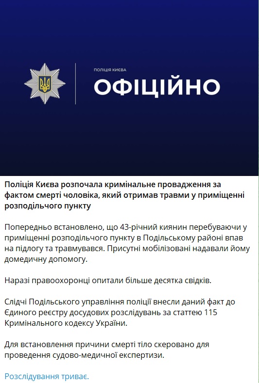 "Предварительно установлено, что 43-летний киевлянин, находясь в помещении распределительного пункта в Подольском районе, упал на пол и травмировался. Присутствующие мобилизованные оказывали ему медицинскую помощь. В настоящее время правоохранители опросили более десятка свидетелей. Следователи Подольского управления полиции внесли данный факт в Единый реестр досудебных расследований по статье 115 Уголовного кодекса Украины", – заявили правоохранители, добавив, что тело отправлено на судебно-медицинскую экспертизу.