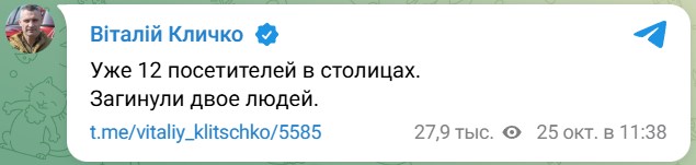 Мэр Киева Виталий Кличко поделился свежими данными о последствиях российского обстрела баллистикой. Согласно обновленной информации по состоянию на 11:20 известно о двух погибших и 12 пострадавших, трое из которых находятся в больницах.