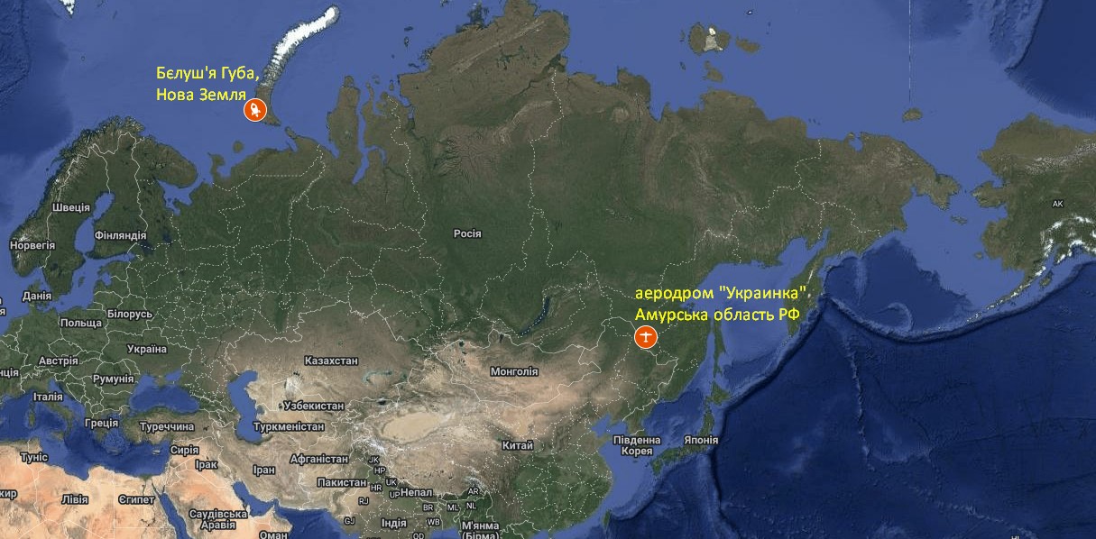 На Google maps можно обозначить точки возможного пуска "Буревестника". В первом случае речь идет о Новой Земле, которая удалена от Украины на расстояние 2 500 км, а от США — 7700 км (если двигаться через Арктику и Канаду) или 4 400 (если в сторону Аляски). Если ракета взлетала из Амурской области, то оттуда несколько большая угроза для США (4 300 км), чем для Украины (около 6 000 км).