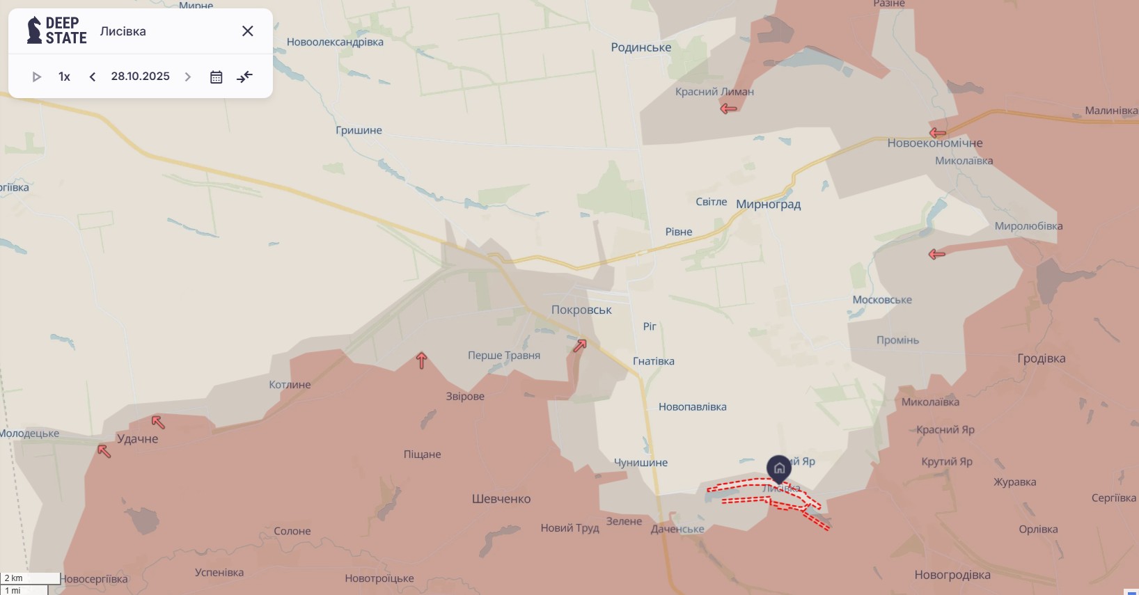 На карте аналитиков DeepState последнее обновление ситуации в Покровске состоялось утром 30 октября. Новые отметки появились к юго-западу от Покровска: ВС РФ продвинулись в районе населенного пункта Первое Мая. Между тем появилось сообщение корреспондента ТСН Юлии Кириенко, которая написала о том, что россияне заблокировали украинских военных в районе Лисовки, Сухого Яра и Новопавловки. Также отмечается, что враг мог пробраться в Покровск через позиции 32 бригады, командир которой, как подозревает Кириенко, не говорил всей правды о ситуации. Кроме того, россияне просачиваются севернее, в сторону Гришино, а сам Покровск оккупирован частично и разрезан пополам подразделениями РФ, говорится в заметке.