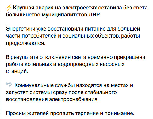 "Крупная авария на электросетях оставила без света большинство муниципалитетов 'ЛНР'. Энергетики уже восстановили питание для большей части потребителей и социальных объектов, работы продолжаются", — заявили администраторы канала.
