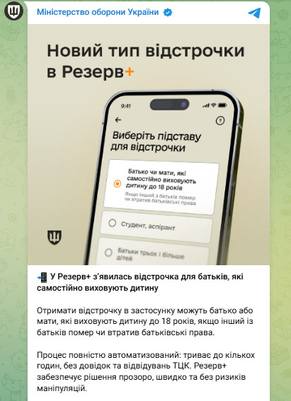 Министерство обороны расширило функционал мобильного приложения "Резерв+", добавив возможность получения отсрочки от службы для родителей, которые самостоятельно воспитывают ребенка. Отныне процесс проходит полностью онлайн и занимает немного времени.