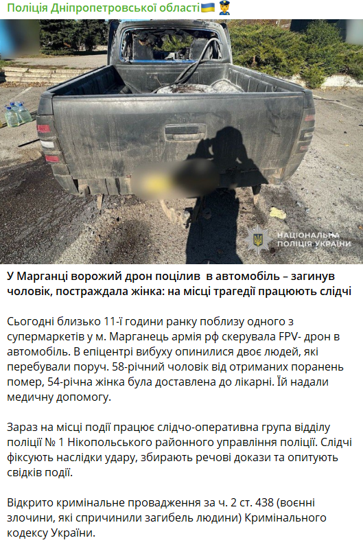 Как сообщили в полиции, оккупанты направили FPV- дрон в гражданский автомобиль. Все произошло недалеко от супермаркета.