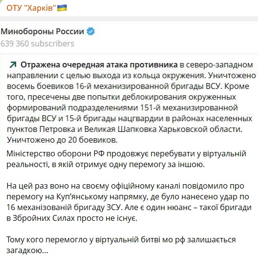 "В этот раз оно на своем официальном канале сообщило о победе на Купянском направлении, где был нанесен удар по 16 механизированной бригаде ВСУ. Но есть один нюанс – такой бригады в Вооруженных силах просто не существует. Поэтому кого победило в виртуальном сражении мо рф, остается загадкой…", – говорится в публикации.