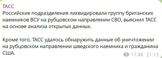 Информационное агентство ТАСС пошло еще дальше и сообщило, что "российские подразделения ликвидировали группу британских наемников ВСУ на рубцовском направлении"