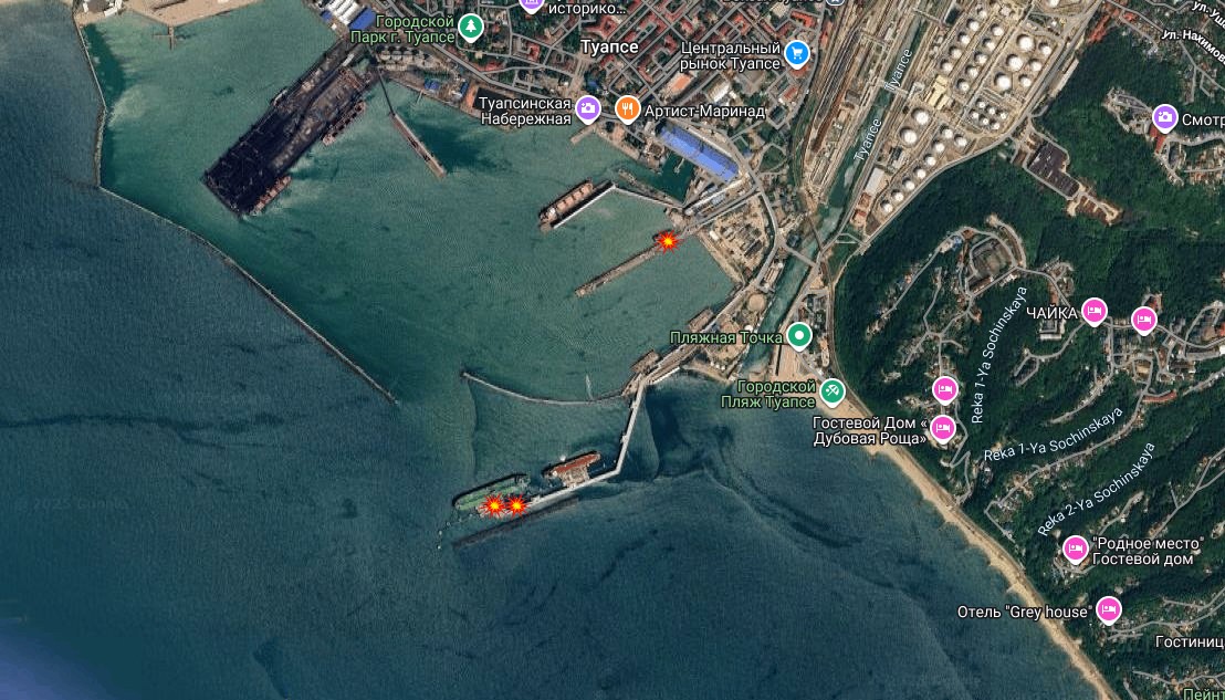 Попадания в Туапсе подтвердили в аккаунте OSINTера с ником bayraktar_1love в соцсети X (Twitter). Аналитик опубликовал инфографику, на которой обозначены точки ударов по порту и спутниковые фото, показывающие, по чему же попали. Видим, что взрывалось минимум в трех точках и, среди прочего, поврежден танкер и зона налива нефтепродуктов. Также уточняется, что может идти речь о повреждении 1-го нефтяного терминала Туапсе — "Глубоководный причал Роснефти".