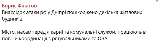 Мєр Днепра Борис Филатов добавил, что повреждения получили несколько жилых домов.