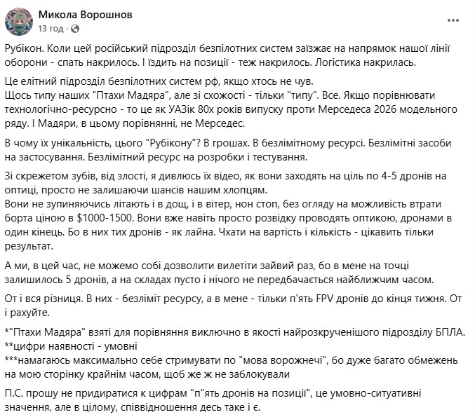 Российское подразделение "Рубикон" наносит удары по логистике ВСУ, по возможностям ротации и безопасного пребывания в блиндажах, написал на странице Facebook украинский военнослужащий Николай Ворошнов. В заметке сравниваются возможности россиян и украинского аналога, условно, 414 бригады "Птицы Мадяра". По мнению Ворошнова, россияне имеют значительное преимущество благодаря доступу к неограниченным ресурсам на разработку, изготовление, закупку, использование любых видов БпЛА.
