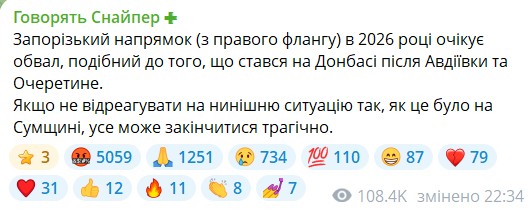 В канале "Говорят Снайпер" военный Станислав Бунятов с позывным "Осман" написал, что на правом фланге в Запорожской области возможен "обвал", похожий на события в Донецкой области после потери Авдеевки. По мнению бойца, на указанное направление следует перебросить дополнительные силы и остановить продвижение ВС РФ, как это сделали в свое время в Сумской области.
