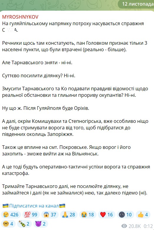 По мнению Мирошникова, есть проблемы с ситуацией на востоке Запорожской области, поскольку после потери Гуляйполя россияне могут продвинуться дальше и подойти к Запорожью. В заметке отмечается, что командование признало потерю сел, но не заметно, чтобы принимались какие-то меры: например, нет каких-то решений по Тарнавскому и переброске новых сил. Обозреватель перечислил населенные пункты, для которых растут угрозы, — это Орехов, Камышеваха, Степногорск и даже южные окраины Запорожья. В Днепропетровской области речь идет о Покровском, а оттуда по трассе N15 — Вольнянск.