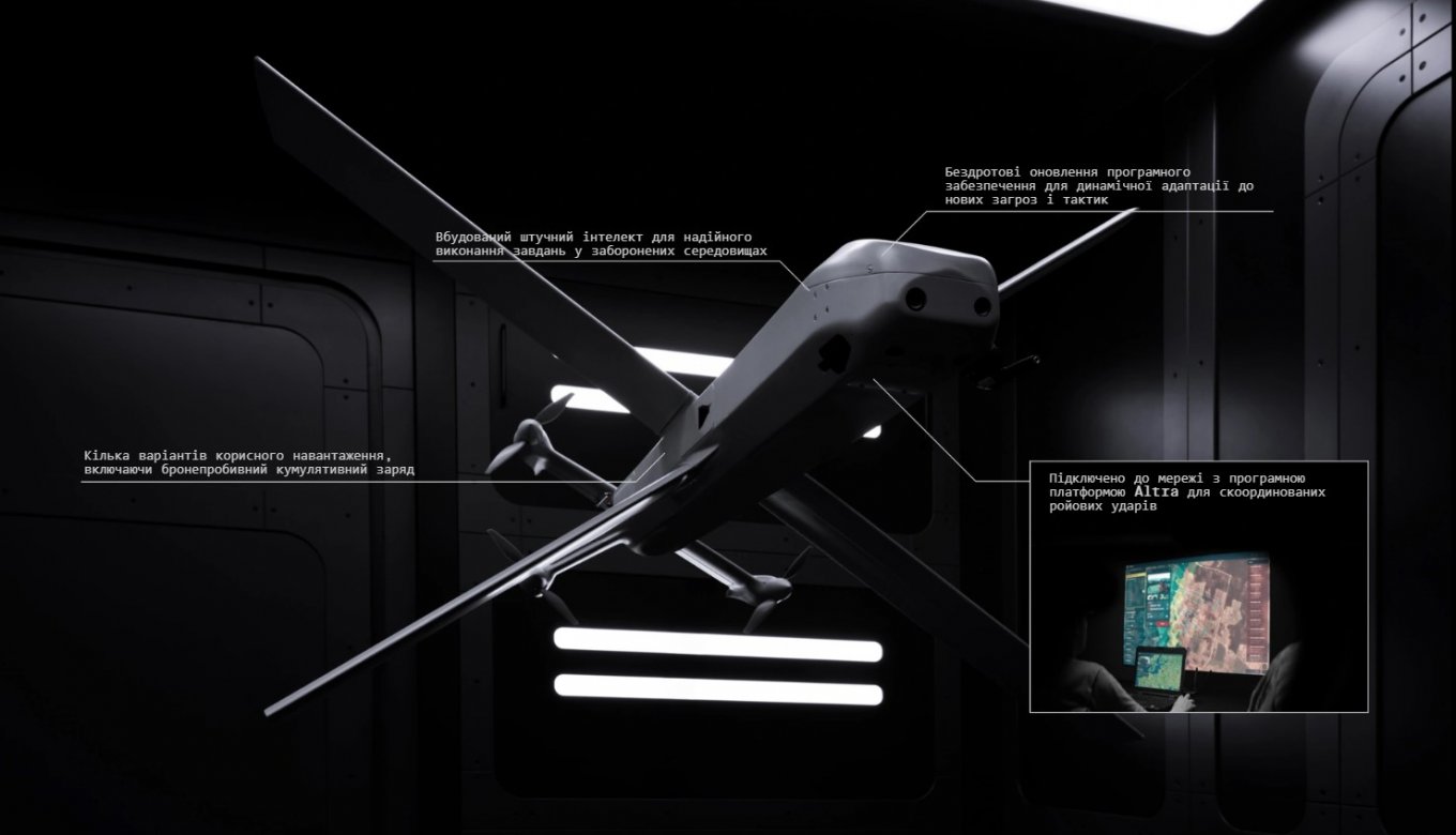 Аппарат оснащен встроенными средствами распознавания целей и может работать в условиях отсутствия GNSS, сопоставляя получаемые изображения местности с загруженными картами. Запуск производится из катапульт и пусковых контейнеров, при этом в будущем рассматривается и вариант транспортно-пусковых контейнеров для массового развертывания.