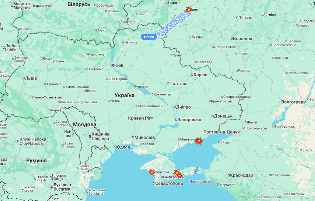 1. В оккупированном Крыму — три цели: предприятие хранения нефтепродуктов "Морской нефтяной терминал" (Феодосия), стоянка вертолетов и склады БпЛА на аэродроме "Кировское", РЛС рядом с Евпаторией.