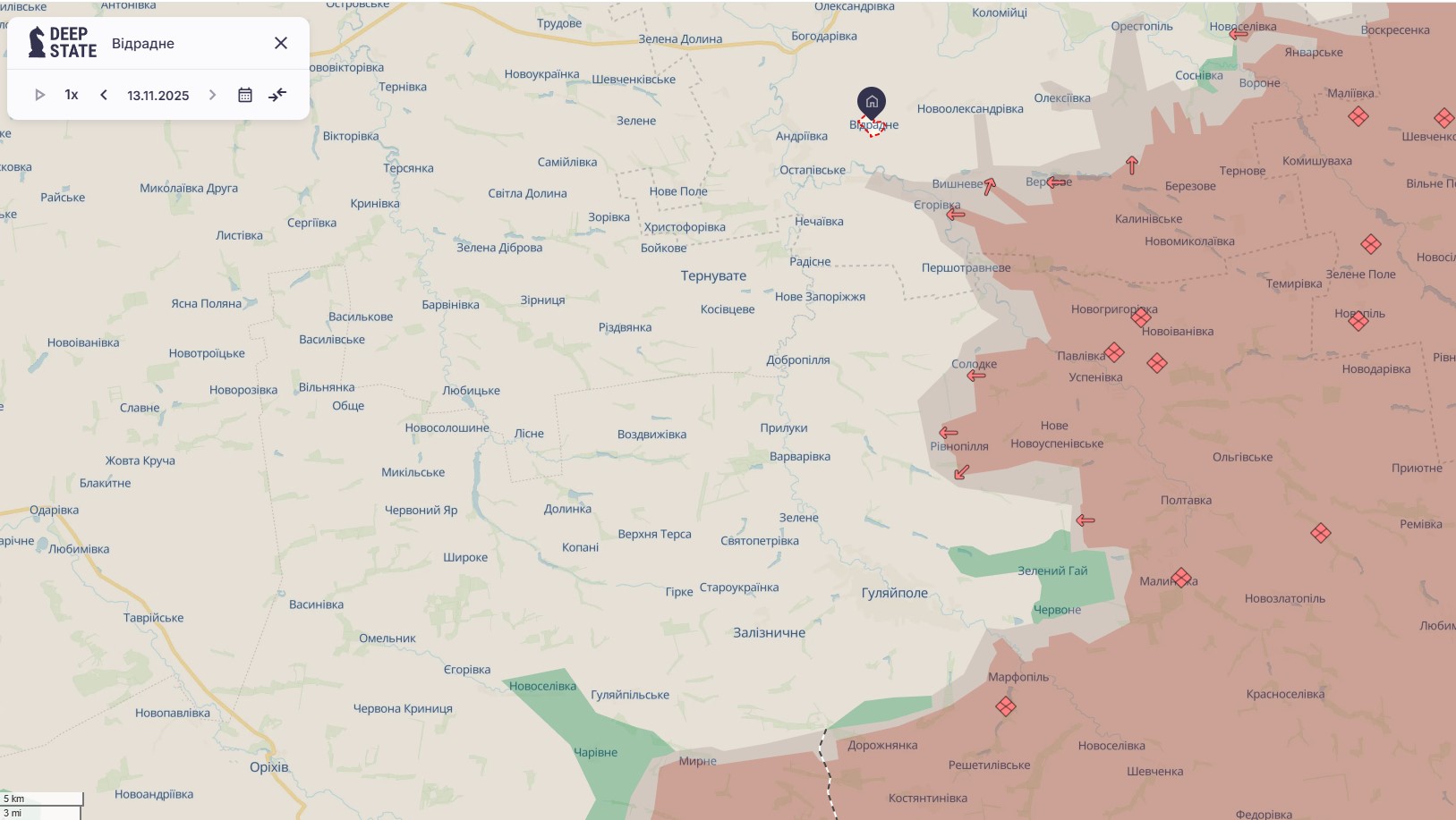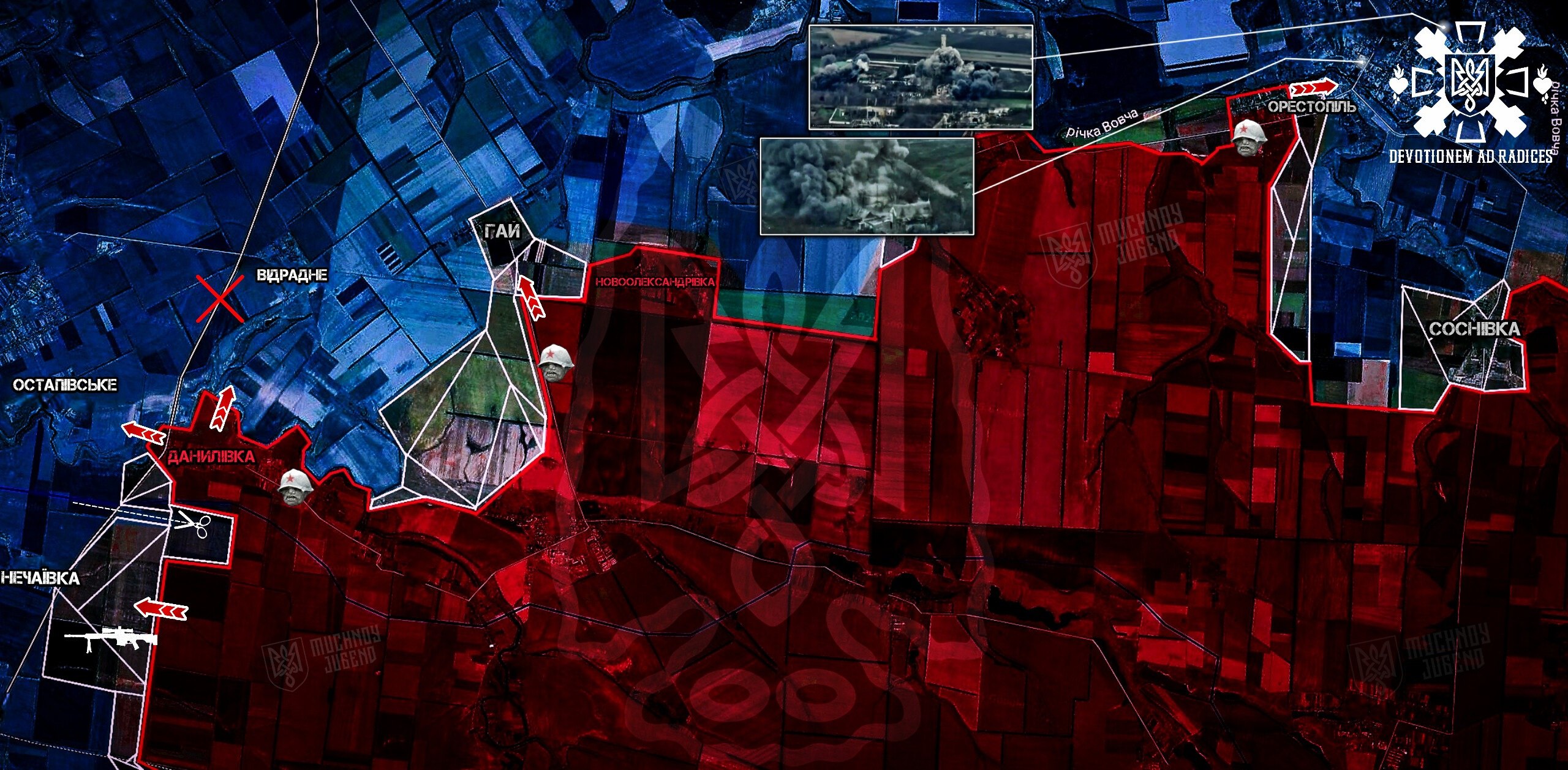 "Подобное мы уже видели на Южно-Донецком направлении, где россияне так же заходили клином, а затем раздували фланги. Также на переднем крае продолжается тяжелая работа за н.п. Гай – населенный пункт сложный, с рельефом и застройкой, что не дает им зайти с разбега. Одновременно они дожимают Орестополь, по имеющейся информации, там уже идут зачистки и выбивание наших очагов сопротивления", — пишет "Мучной"