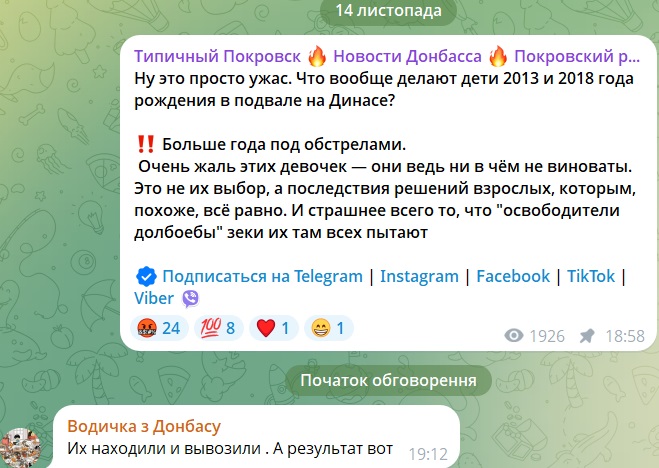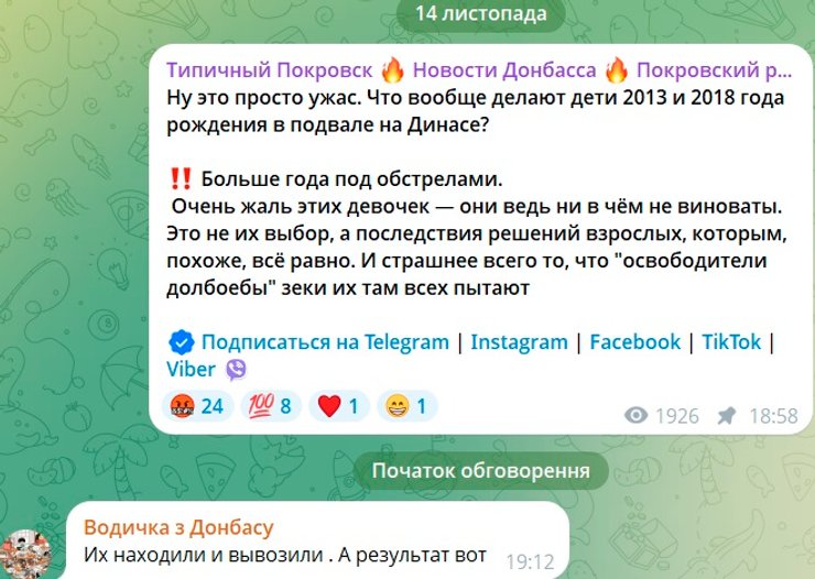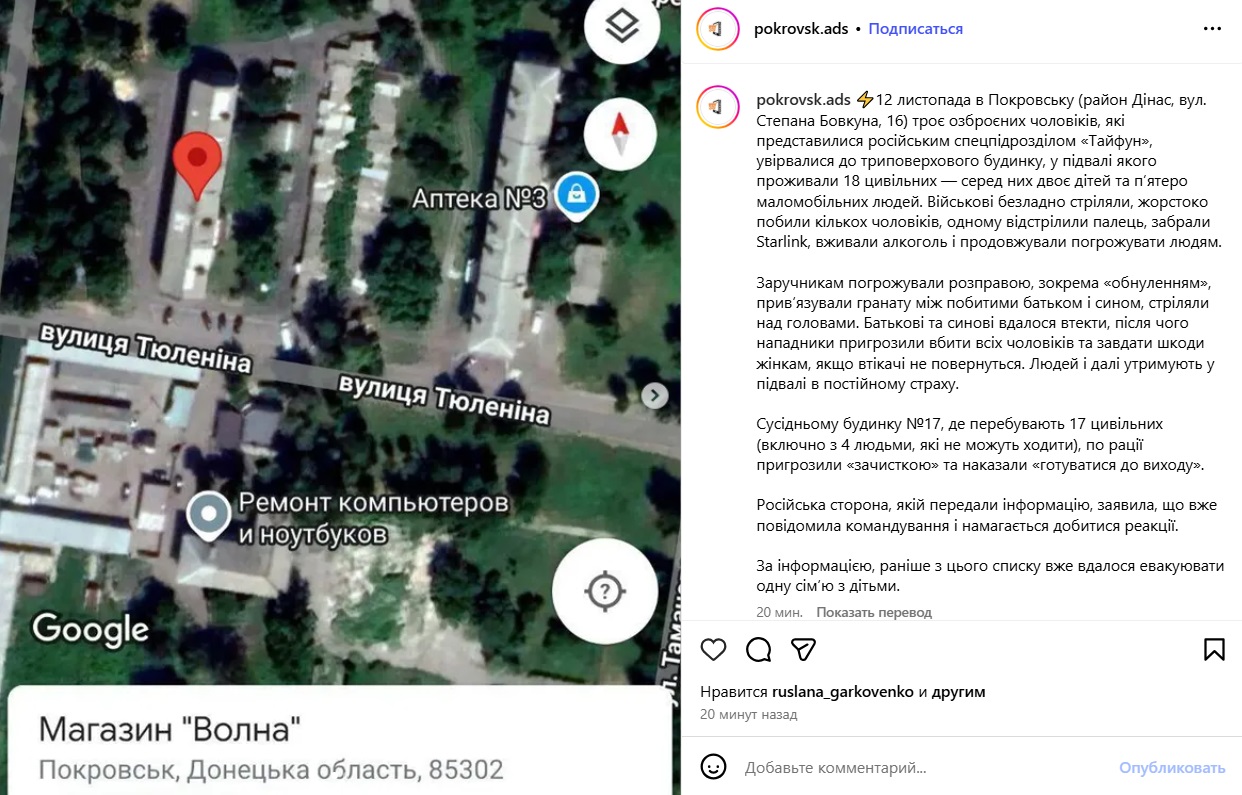 В Instagram на странице pokrovsk.ads говорится, что российская сторона, которой передали информацию, заявила, что уже "сообщила командованию и пытается добиться реакции".