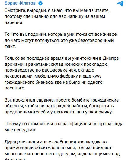 "То, что вы, подонки, которые уничтожают все живое, до чего могут дотянуться, это уже безоговорочный факт. Только за последнее время вы уничтожили в Днепре дронами и ракетами: склад женских прокладок, производство по расфасовке чая, склад с лекарствами, мебельную фабрику и еще кучу гражданского бизнеса, где не было ни одного военного. Вы, проклятая саранча, просто бомбите гражданские объекты, чтобы лишать людей работы, банкротить предпринимателей и уничтожать нашу экономику", – не выбирает выражений автор.