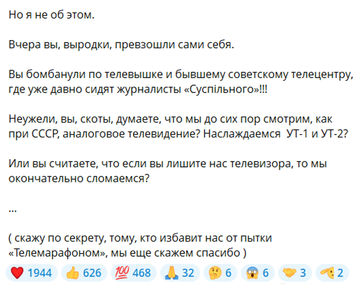 "Вчера вы, выродки, превзошли сами себя. Вы бомбанули по телевышке и бывшему советскому телецентру, где уже давно сидят журналисты "Суспільного"!!! Неужели, вы, скоты, думаете, что мы до сих пор смотрим, как при СССР, аналоговое телевидение? Наслаждаемся УТ-1 и УТ-2? Или вы считаете, что если вы лишите нас телевизора, то мы окончательно сломаемся?" – спрашивает он.