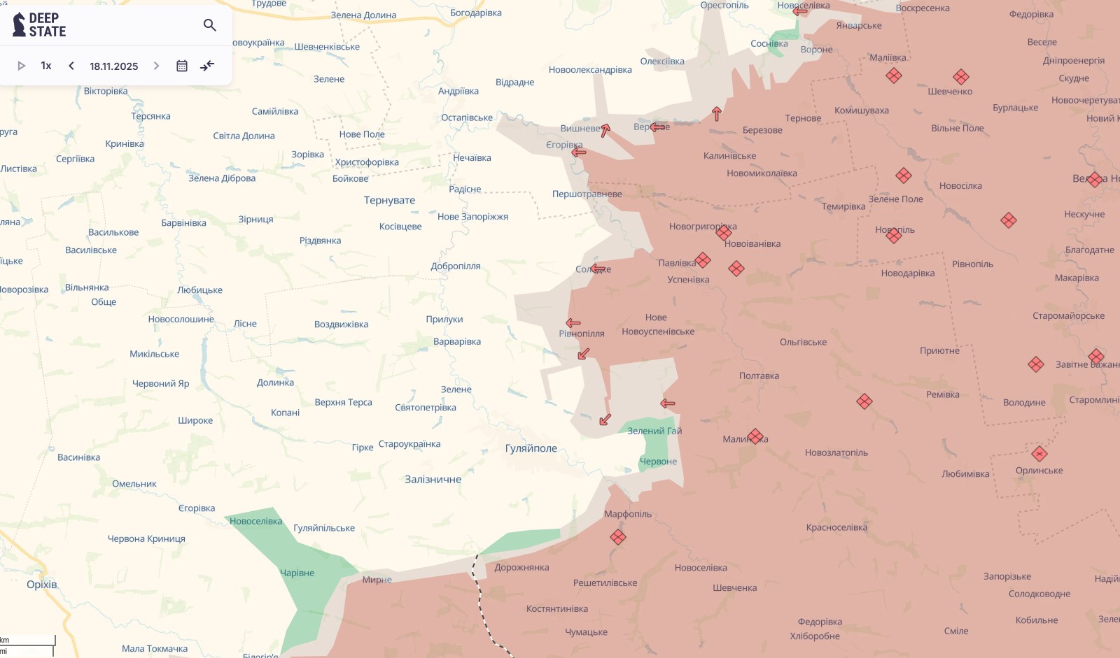 Менее чем за месяц российские силы продвинулись на 10–12 км и приблизились к Гуляйполю на дистанцию 4–5 км. Однако прямого штурма города оккупанты избегают — российское командование пытается перерезать основные маршруты снабжения, чтобы постепенно изолировать украинский гарнизон.