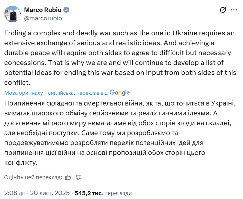 Сообщение Рубио появилось в X в ночь на 20 ноября, через несколько часов после публикаций медиа о существовании плана завершения войны, над которым тайно работали США и Россия. Чиновник при этом отметил, что для мира должен быть "широкий обмен серьезными и реалистичными идеями" и Вашингтон, как выяснилось, готов генерировать следующие потенциальные идеи с учетом позиций Киева и Москвы.