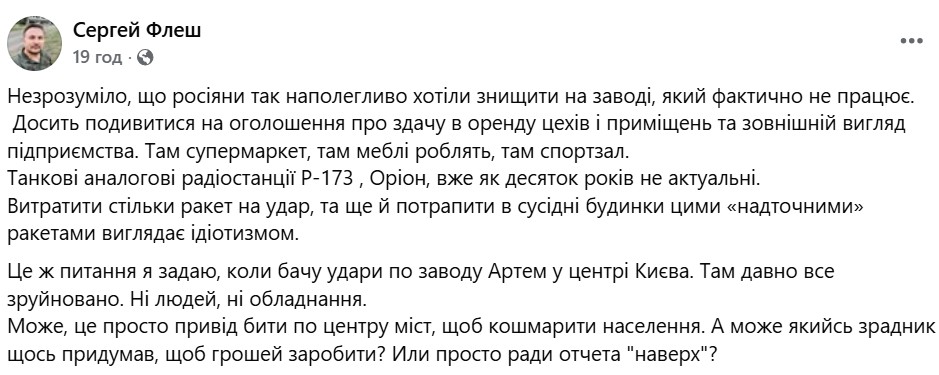 "Непонятно, что россияне так настойчиво хотели уничтожить на заводе, который фактически не работает. Танковые аналоговые радиостанции Р-173, Орион, уже как десяток лет не актуальны. Потратить столько ракет на удар, да еще и попасть в соседние дома этими "сверхточными" ракетами выглядит идиотизмом", — написал Бескрестнов.
