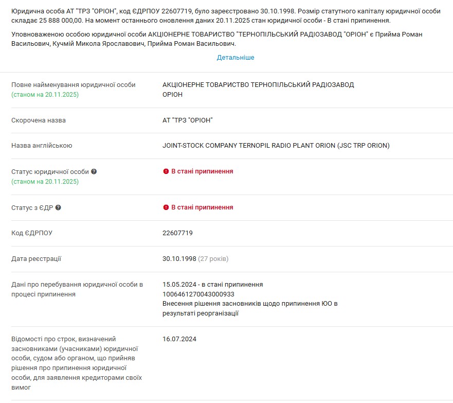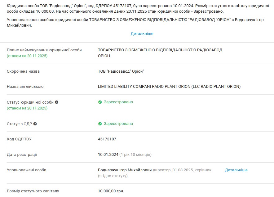 В то же время, на Youcontrol указано, что существует ООО "Радиозавод "Орион" в Тернополе, который и дальше занимается производством средств связи.