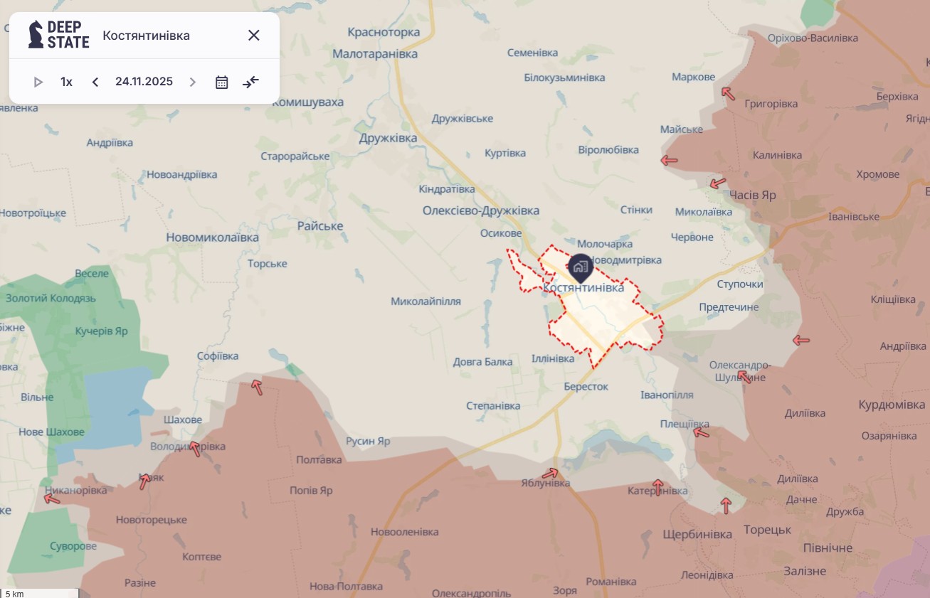 Константиновка является важным транспортным и логистическим узлом. Город прикрывает ключевые дороги на Славянск и Краматорск, а также находится на трассе Покровск — Константиновка. В случае потери города Россия получила бы плацдарм для дальнейшего наступления на Славянско-Краматорскую агломерацию. На карте аналитиков DeepState по состоянию на 24 ноября указано, что в серой зоне — крайние южные окраины города. Последние изменения на линии боев появились 22-23 ноября: россияне продвинулись на 0,5-1,5 км около Катериновки и Щербиновки.