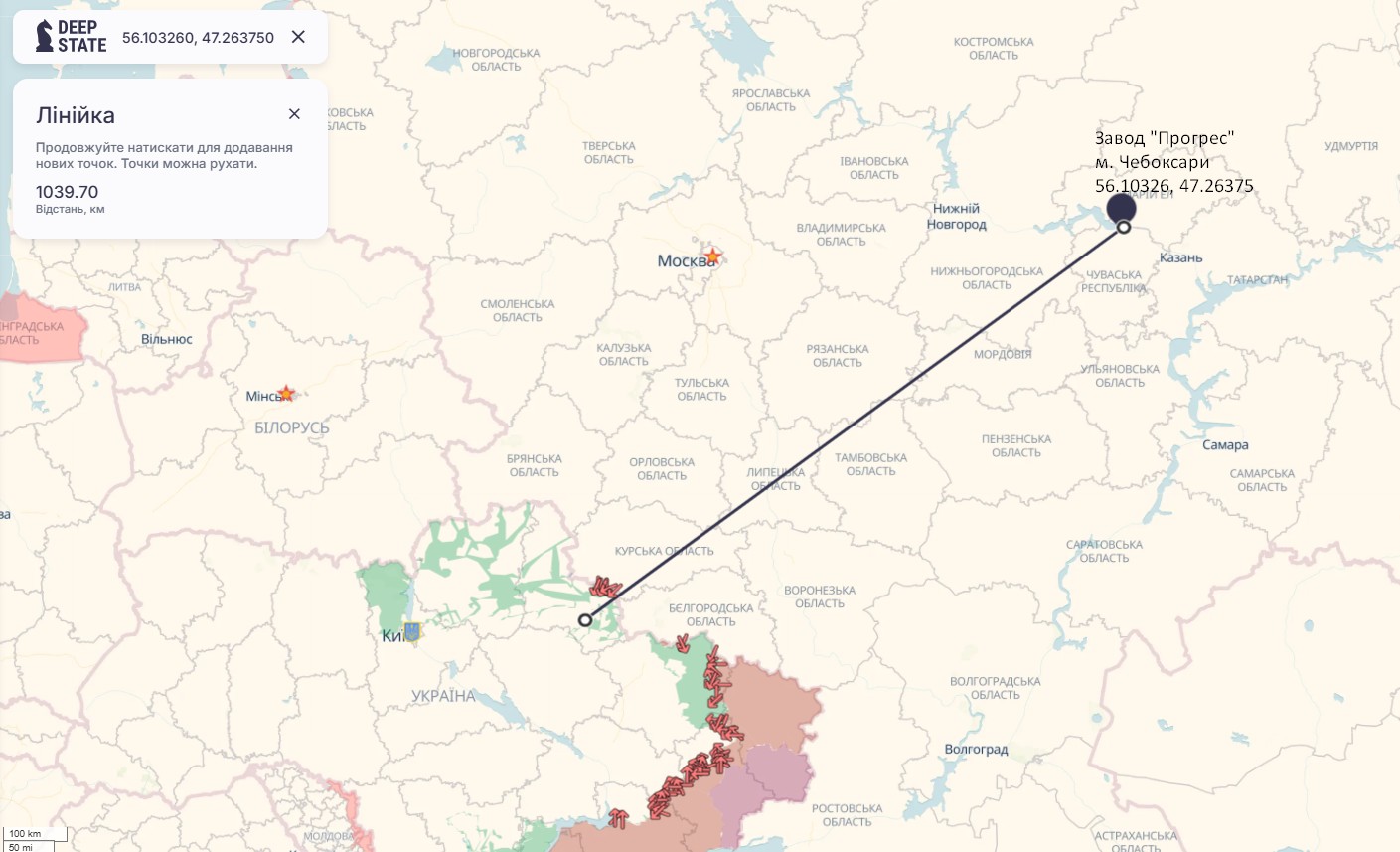 На видео командующего СБС появились корпуса "ВНИИР-Прогресс" в Чебоксарах. На Gooogle maps можно отыскать указанный объект, который имеет координаты 56.10326, 47.26375. Ориентировочное расстояние до Украины — около 1000 км. При этом дроны СБС должны были пройти систему противовоздушной обороны ВС РФ в семи регионах России.