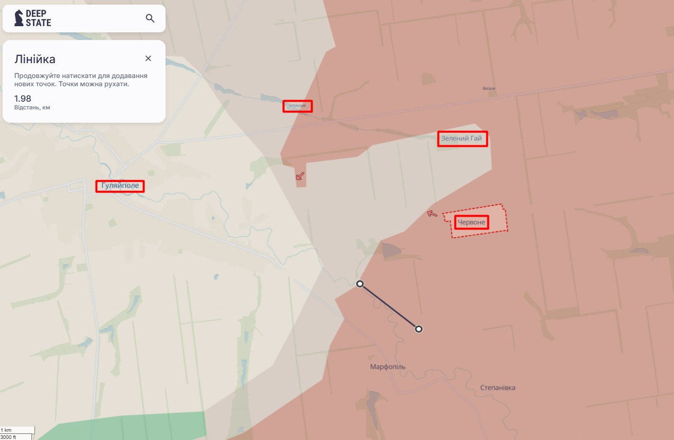 Гуляйполе. На Гуляйпольском направлении ВС РФ оккупировали село Высокое (ранее — Красное) и продвинулись возле сел Затишье (на северо-востоке) и Марфополя (на юго-востоке). Ориентировочное продвижение россиян возле Высокого — почти на 2 км.