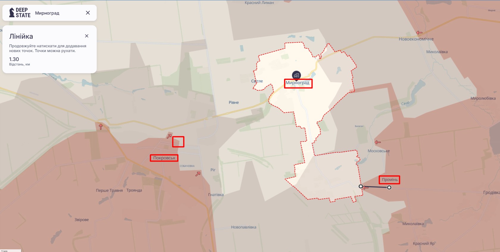 Покровск–Мирноград. Аналитики сообщили, что ВС РФ заняли новые улицы в Покровске и оккупировали село на юго-восточной окраине — населенный пункт Проминь. Ориентировочное продвижение россиян: в Покровске — около 1 км, ближе к железнодорожному вокзалу в центре, у Мирнограда–Променя — почти на 2 км. Карта DeepState показывает, что серая зона, простреливаемая российскими войсками, заходит за северные окраины Покровска, но не соединяется с пятном, которое тянется от Родинского и Красного Лимана. Расстояние между этими зонами — около 1,2 м. Расстояние до самой дальней позиции под Мирноградом — 11 км до углубления рядом с Миролюбовкой, 13 км до Сухого Яра и Лисовки.