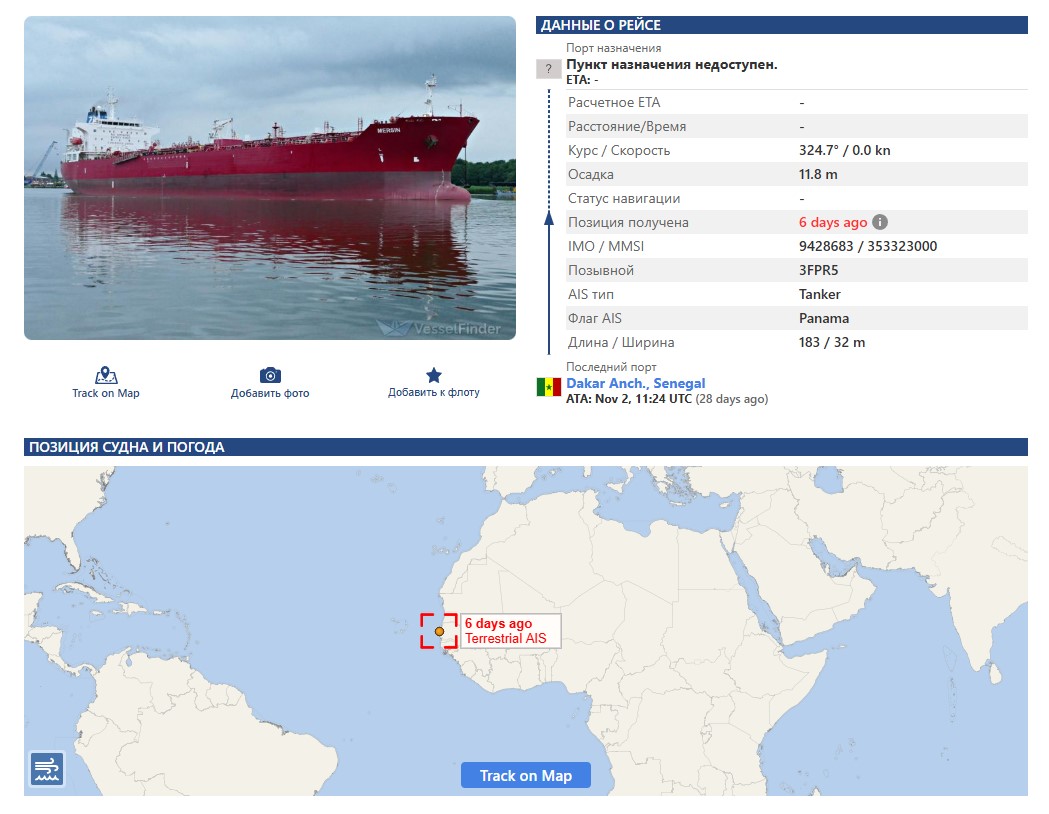 Отметим, что на мониторинговом ресурсе Vessel Finder указывается, что пункт назначения судна неизвестно, однако эта информация — от 24 ноября. Актуальных данных о маршруте и местоположения танкера пока нет. Также неизвестно, принадлежало ли судно к так называемому "теневому флоту" россиян, корабли которого экспортируют российскую нефть.