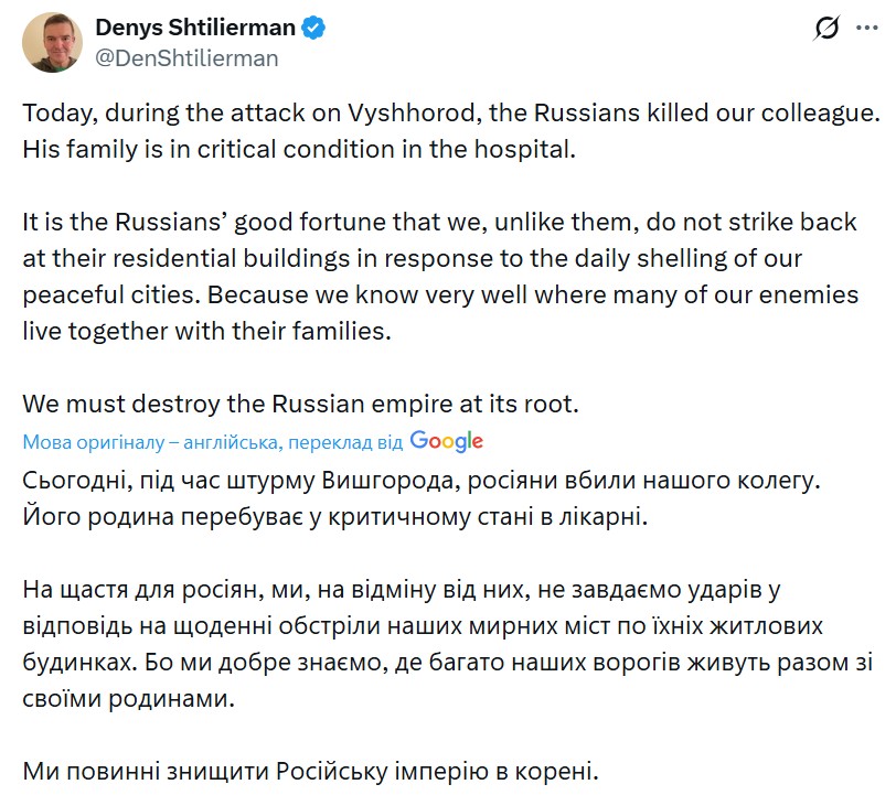 Штилерман подчеркнул, что Украина знает, где живут российские разработчики ракет. Также руководитель Fire Point написал, что Российскую империю следует разрушить "в корне".