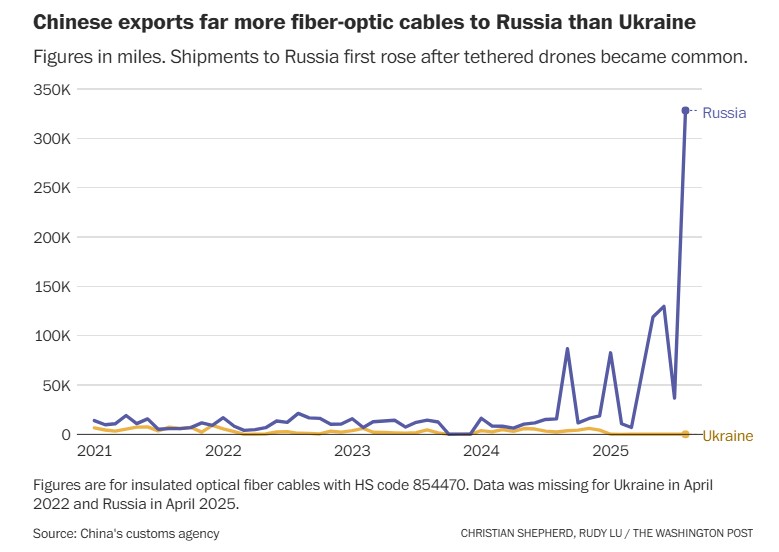 The Wahington Post отметило стремительный рост поставок оптоволокна из Китая в РФ в 2025 году: в мае-июне — 190 тыс. и 200 тыс. км соответственно, в августе — 500 тыс. км. Между тем экспорт в Украину стабильно ниже — на уровне, ориентировочно, 115 км кабеля.